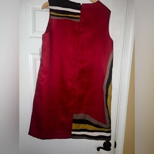 This stylish sleeveless dress features a vibrant multicolor design, perfect for any occasion. The bold red, black, and white pattern adds a modern touch to your wardrobe.