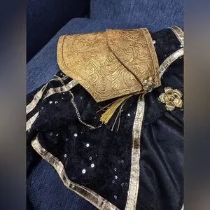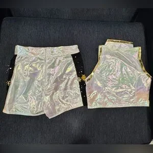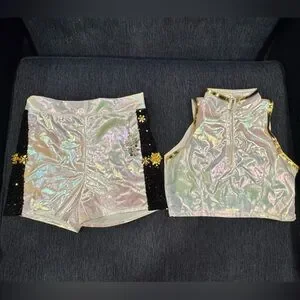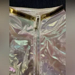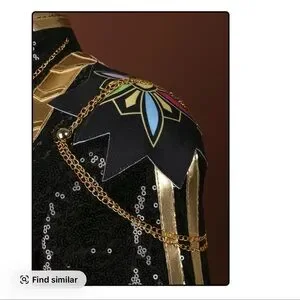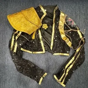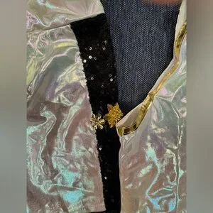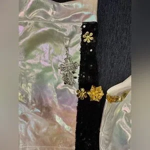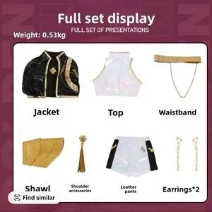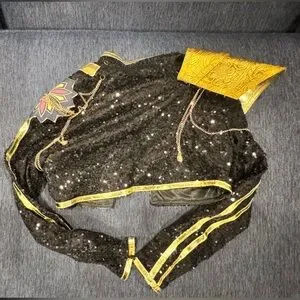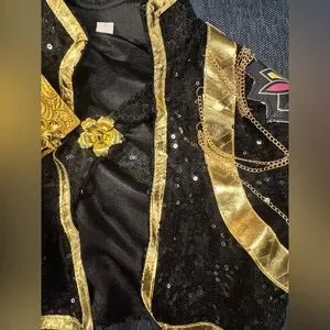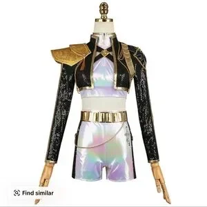 This is the best quality Rumi costume I have found. details are beautiful and good quality. Sequins and chains are real not printed. Zipper closure on the back of the shorts and front of the top. “X” detail in the front of jacket is attached by Velcro for easy removal to put on.