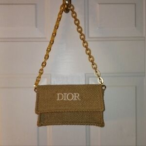 Chic Dior clutch with a gold chain. Perfect for elegant outings. Features a stylish woven texture. Accented with luxury gold chain.