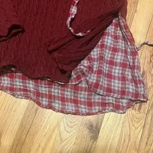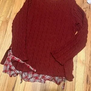 Stay cozy and stylish with this red cable knit sweater. Perfect for layering, it features a classic design that pairs well with any outfit. Approx measurements done with AI