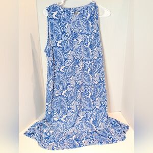Stylish sleeveless dress with a blue paisley pattern. Perfect for casual outings.