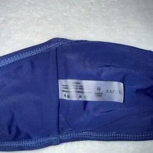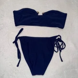 deep blue bikini with gold detail. Strapless with tie waist bottoms