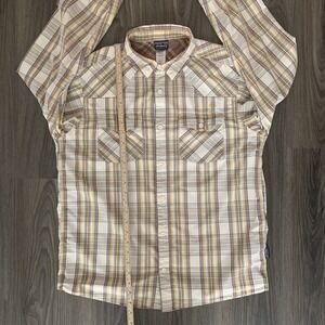 Patagonia Organic Cotton Tan Plaid Button Up Long Sleeve Men's M flaw*