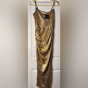 Unleash elegance with the Gold Rubi Cowl Neck Cocktail Dress from JLUXLABEL. This sophisticated slip dress exudes luxury with its shimmering gold fabric and flattering cowl neck design. The form-fitting silhouette and sleeveless style make it a perfect choice for glamorous cocktail events or an upscale night out. Pair it with heels and statement jewelry to complete the stunning look. Elevate the evening attire collection with this timeless piece that promises to turn heads. Stretchy!