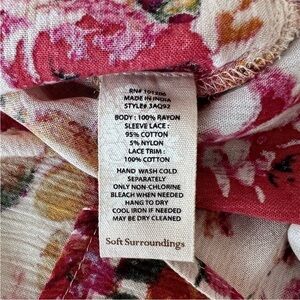 Soft Surroundings, Floral Print, Crochet Lace Detail, Cold Shoulder Top. Bell sleeves. Front keyhole with button closure. Snaps on shoulders to hold bra straps in place. Body 100% rayon, sleeve lace 95% cotton 5% nylon, lace trim 100% cotton. Size PS. See photos for measurements to ensure fit.