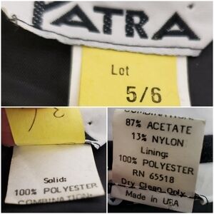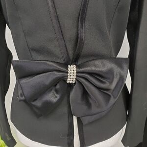 Jacket is acetate and satin trim and bow with rhinestones, snaps shut, peplum, shoulder pad