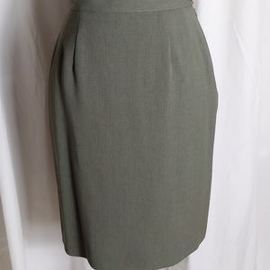 Like new John Meyer of Norwich olive green skirt suit. Pencil skirt is lined, has a side zipper & double kick pleats.