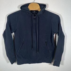 Comfortable navy blue hoodie. Features a full zip and adjustable drawstring. Perfect for casual wear.