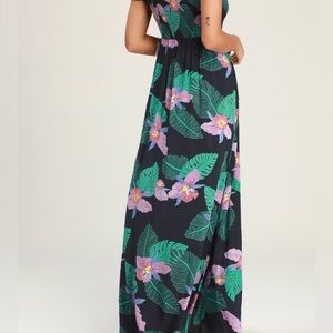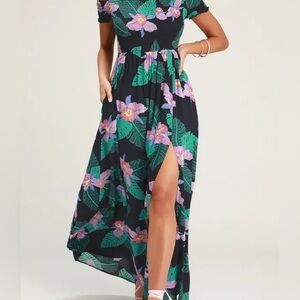 Grab a sunhat and a margarita because the Lulus Patsy Navy Blue Floral Print Off-the-Shoulder Dress is vacay ready. Lightweight woven navy blue fabric, with a purple and green tropical floral print, shapes a smocked bodice and short, off-the-shoulder sleeves. Flowy maxi skirt with side slit at front finishes the beachy look. Side seam pockets.