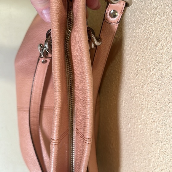 Preowned. Logo keychain not included. Notice small spots on both of top buckles as pictured. Also small spot inside lining as pictured normal wear on top of bag is pictured. Bag measures 12 inches across by 10 inches deep 4 inches across the bottom. Handle drop is 4 inches shoulder strap is 10 inches. Please feel free to message me with any questions or offers. Please examine photos carefully of this bag being sold.