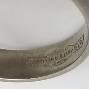 Lovely vintage cocktail statement ring by Whiting & Davis. Ring has a goldtoned filigree style oval frame set with large irridescent red/purple foiled art glass cabachon gem. Goldplating has worn off of most of band so it appears silver instead of gold, other than that it's in great condition. Ring is a size 8. Stamped Whiting & Davis on inside of band.