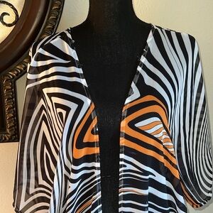 Women’s Animal Print, Sheer, Lightweight, Cap Sleeve, Full Length, Maci Kimono. Black White Zebra pattern with bright orange accents. NEW without Tags! 100% polyester- machine wash on gentle cycle.