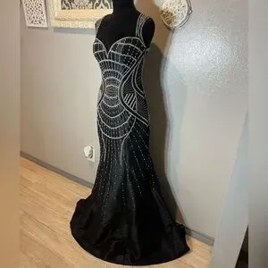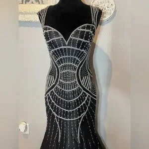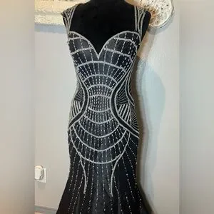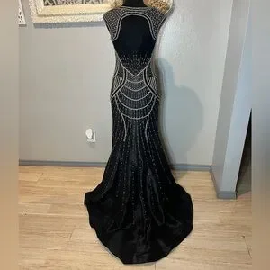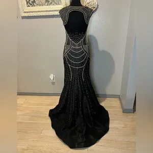 Stunning black dress with intricate silver beadwork. Perfect for prom or formal events. Size 6 bust 36” waist 28” hips 38” length 61”