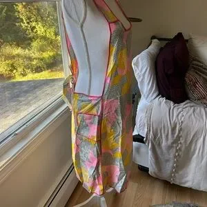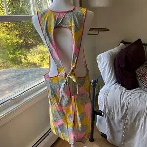 This vibrant apron features a playful mix of pink, yellow, and gray patterns.