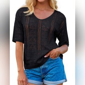 New Grace Karin short sleeve black crochet knit lightweight sweater with v neck.
