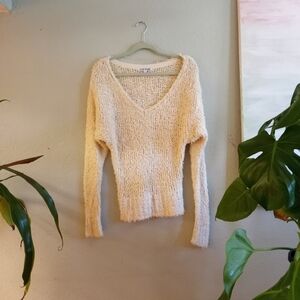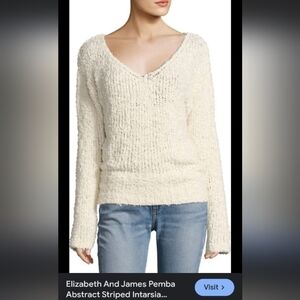 Elizabeth and James Cozy Knit sweater, Chenille style, Wide Deep V Neck that can be worn almost Off Shoulder, Classic, Fuzzy, Comfy, Preppy, 81 percent Cotton, 19 percent nylon Stretchy, Tennis Prep, Old Monet, Academia