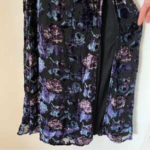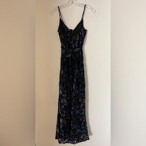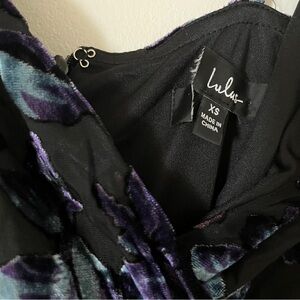 Lulu’s velvet burnout floral pattern on a black backdrop chiffon overlay dress. Belt tie included, thigh high skirt, spaghetti strap v-neck design with hidden back zipper. Floor length, lovely for prom or wedding guest or really any formal event!