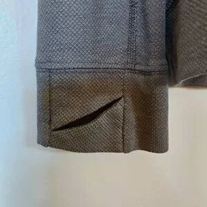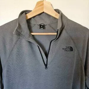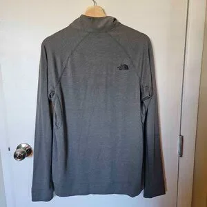 The North Face Quarter-Zip Shirt. Size Large. Grey color with Black accents. Flashdry technology fabric. Polyester/Wool blend. Has thumb holes. Lightweight and comfortable, perfect for outdoor activities.
