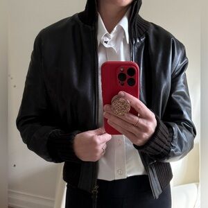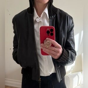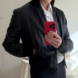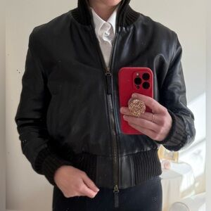 Fratelli Rossetti chocolate brown leather bomber jacket. Very soft 100% italian leather in rich dark chocolate brown with brown ribbed collar and cuffs. Size 44, fits like a small. 2-way aged brass color zipper and functional pockets. Like new condition.