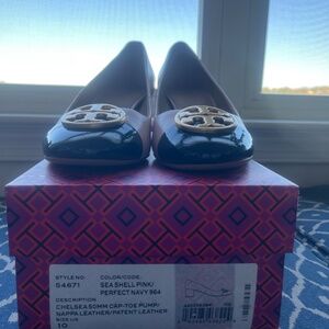 Brand new in box Tory Burch Chelsea 50mm Cap-toe Pump Seashell Pink/Perfect Navy Pump size 10. Beautiful, classic, stylish shoes perfect for any occasion!