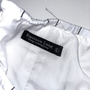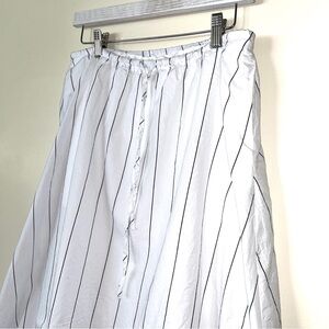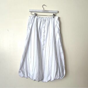 Elegant white with pin black stripes midi bubble skirt by Emerson Lang. Perfect for any occasion. Dress it up or down. Take a great fashion trend to the next level with a midi length.