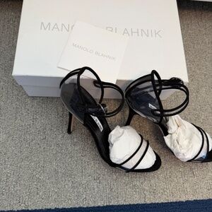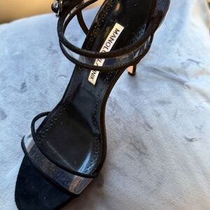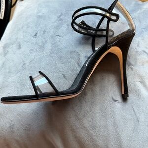 New in box Manolo Blahnik Fersen 105 Black Suede and clear vinyl dorsay sandal.