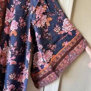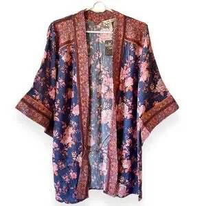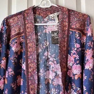 Size XS/S Matilda Jane, Olivia Floral Print Chiffon Kimono. Gorgeous and light weight. Gold metallic thread throughout. 99% Viscose. 1% metallic. Machine washable. Perfect for layering. No flaws. New with tags attached. I have three of these, all new and listed separately. Bundle for discount!
