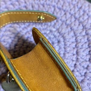 Charming cell phone holder with heart charms. Features multicolor logo design.
