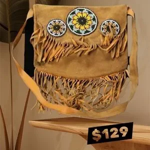Navajo Hide Hand Beaded Fringed Tan Shoulder Bag Antique. FLASH SALE