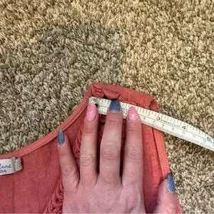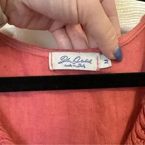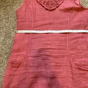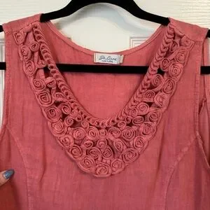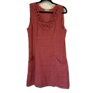 Blu Orchid Coral Pink Solid Italian Linen Rosette Neck Sleeveless Mini Shirt Dress. Pullover style with round neck embellished with rosette bib. Cotton, ribbed panel inserts on the sides of the dress. Rounded pockets on the front. Color is a coral pink with some reddish hues.