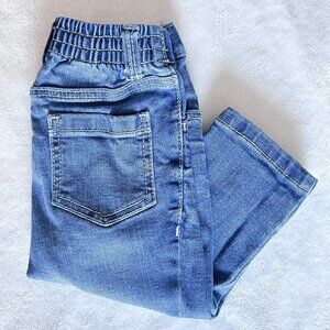 Old Navy straight leg jeans for babies or toddlers. Medium wash denim. Size 12-18 months. Stretch to fabric. Real pockets. Front button, but no zipper. Elastic on waist in back. 86% cotton, 12% polyester, 2% spandex/elastine.