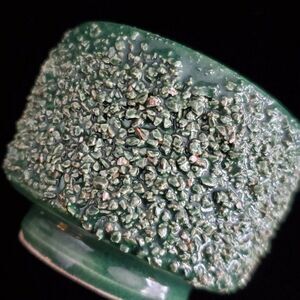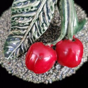 This is a really nice piece of Majolica Palissy Pottery. It features a Lidded Bowl / Jar with applied Leaves and Cherries on the top of the lid. The lid and bowl also have hand applied mini pottery chips for texture. Really well done with a lot of detail.