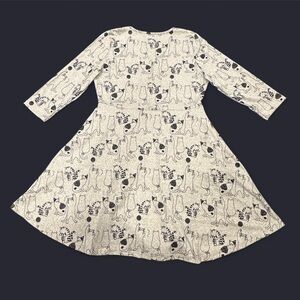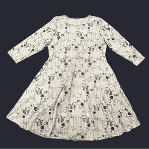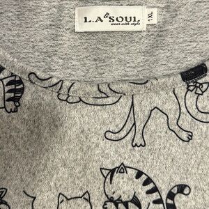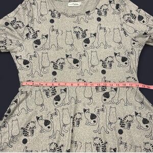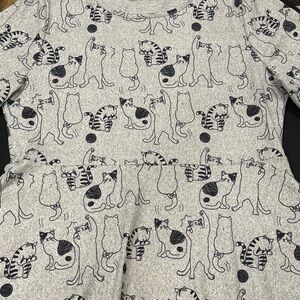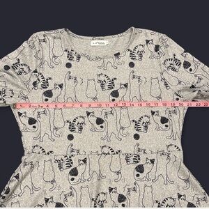 Grey stretch knit dress with whimsical cat print, long sleeves and pockets.