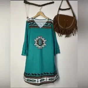 Embrace a bohemian vibe with this teal midi dress. Perfect for casual outings, it features intricate patterns and a relaxed fit.