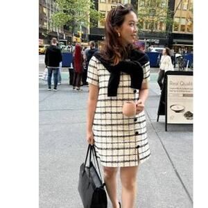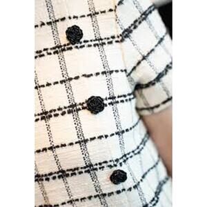 Mini-length shift dress with fitted short sleeves Close crew neckline Princess seam on wearers left side that opens at hem for mini slit Black resin rose buttons placed along princess seams 2” hem allowance Tweed 76% Cotton, 20% Polyester, 4% Nylon Wash instructions: Do not wash, Do not bleach, Do not tumble dry, Dry clean only, Iron low heat Model height is 5’10 ½ | Dress length is 34”