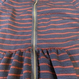 Stylish long sleeve dress by Maeve. Features navy and red stripes. Perfect for any occasion.