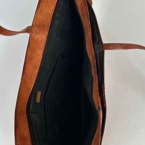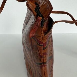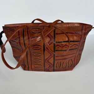 Carry a statement piece of wearable art with this vintage 80s hand-painted genuine leather tote bag, made in India. The design features a bold, bohemian abstract pattern in warm earthy tones with artistic, tribal-inspired linework.