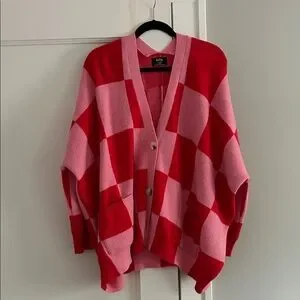 Eye-catching cardigan by Dressed in LALA. Features a striking red and pink checkered design. Perfect for adding flair to any outfit. Size is S/M
