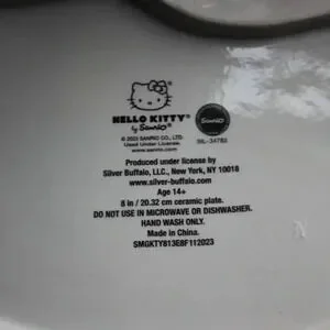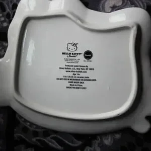 This adorable Hello Kitty Jewelry Tray/Decorative plate is so cute! With her gold bow, she looks stunning. Hand wash only, this is an 8-inch plate. Some wear marks from being on a store shelf.