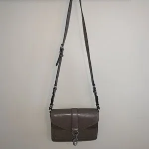 Stylish gray/brown leather Rebecca Minkoff Hudson mini moto crossbody bag. Features a sleek design. Perfect for everyday use.