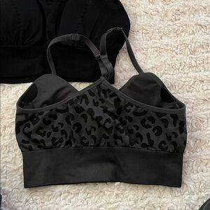 Great work out bra duo with solid black and leopard print designs