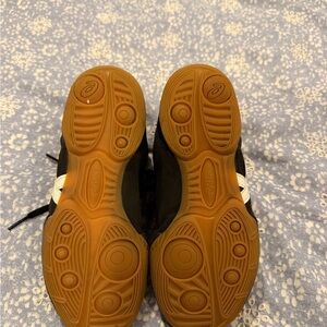 Stylish ASICS wrestling shoes for kids. Black upper with white accents. Durable and comfortable for active play.