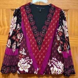 Elegant blouse with floral patterns. Features deep V-neck and long sleeves. Ideal for stylish outings. Pleated bell sleeves! Elegant and boho! EUC #281