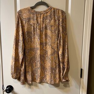 Democracy clothing Lovers. Elegant cheetah print blouse with a relaxed fit. Features a stylish V-neck and 2 ruffles across front . Back has a yoke and then material is slightly gathered.. Long sleeve with elastic gathering and ruffle at the end of that!!! 1X. Lightweight So so cute and playful