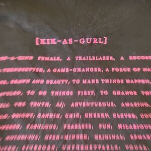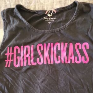 Black sleeveless top featuring bold pink '#GIRLSKICKASS' graphic. Juicy Couture branding.