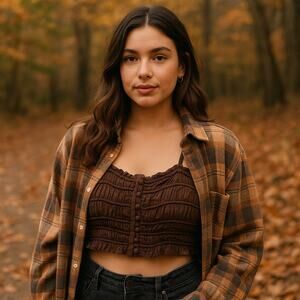 boho chic, fall festival outfit, cottagecore, earthy neutral tones, ruched crop top, crinkle texture, button front cami, brown top, chocolate brown, autumn layering, coquette boho, urban outfitters aesthetic, indie boho, flannel layering piece, soft girl, feminine romantic style