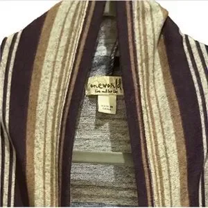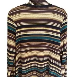 Chic open cardigan with purple, brown, and cream stripes. Perfect for layering.