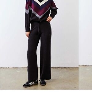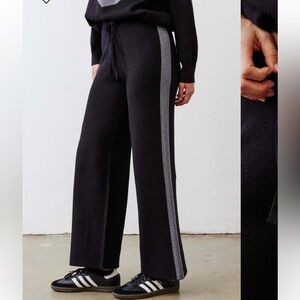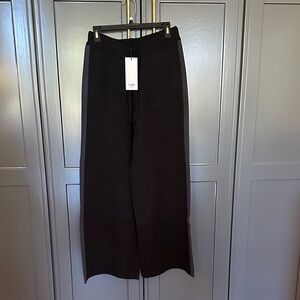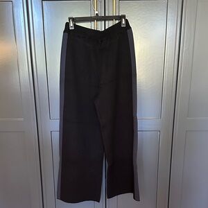 Discover the perfect blend of comfort and style with these elegant black and gray track pants. Beautiful, high quality thick, tight woven knit. The tag says navy/ black, but they look black to me with grey stripes down the sides. NWT