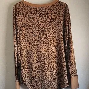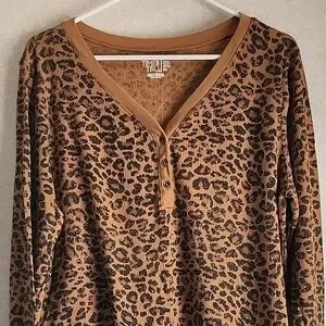 Chic leopard print top with 3 button front. Features long sleeves and a stylish design.27" approx shoulder to hemline