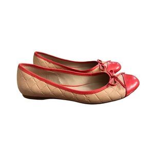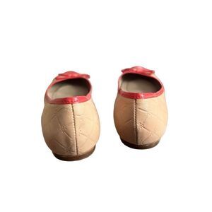Quilted Peachy Pink Logo Ballet Flats Size: US 8 Signature: Jack Rogers Very pretty rounded toe ballet flats feature patent leather bow, toe and lining; JR logo quilted leather; leather sock; leather outsole; .25-inch heel lift. GUC some signs of wear pictured